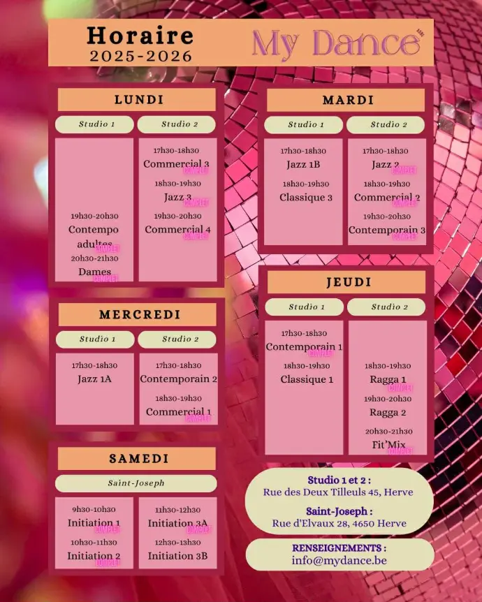 Les professeures se réservent le droit de changer un élève de niveau.Une liste d'attente à été mise en place pour les cours complets, inscription par mail à info@mydance.beGuide des âges Nos tarifs